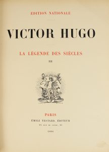 Edition nationale prestigieuse éditée au lendemain de la mort de Victor Hugo, elle se compose de sept parties reliées en 43 volumes. Poésie (15 volumes), Théâtre (5 volumes), Roman (14 volumes), Histoire (2 volumes), Philosophie (2 volumes), Actes et Paroles (3 volumes), et Voyages (2 volumes), chaque reuvre dotée d'une tomaison propre. L'illustration comprend de nombreuses vignettes en tète et 218 figures hors texte d'après Bracquemond, Collin, Flameng, Giacomelli, Henner, Jeanniot, Laurens, Luc-Olivier Merson, Moreau, Rochegrosse, Rodin, Rudaux, etc., gravées à l'eau-forte par Boillot, Bracquemond, Champollion, Courtry, Gaujean, Géry-Bichard, Muller, etc. Taches au dos de quelques volumes, sinon l’exemplaire est solidement relié par Louis Guétant, relieur lyonnais.