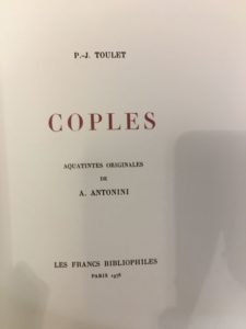TOULET (Paul-Jean). Coples. Paris, Les Francs Bibliophiles, 1978. Petit in-4°, en feuilles, sous couverture, chemise et étui de l'éditeur. Aquatintes originales par Annapia ANTONINI. Tiré à 170 exemplaires sur vélin de rives, celui-ci (n° 11), imprimé pour M. Jacques Thery.