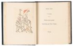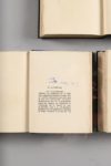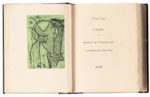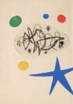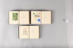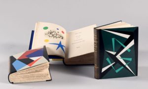 TZARA (Tristan). L'Antitête. • Monsieur Aa l'Antiphilosophe. •• Minuits pour géants. ••• Le Désespéranto. S. l., Bordas, n. d. [Paris, 1949]. Ensemble 3 volumes in-12, box noir, large décor géométrique mosaïqué ornant les plats, dos lisse, tête dorée, non rogné, couvertures conservées, chemises et étui commun (P. L. Martin - 1957). • Huit eaux fortes en couleurs par Max ERNST. •• Sept par Yves TANGUY. ••• Huit par Joan MIRÓ. Tiré à 200 exemplaires, chacun (n° 106), un des 169 sur auvergne, signés par l'auteur et l'artiste. Dos passés ; quelques légères rousseurs ; tout petit accident sur le second plat du premier volume et à l'étui, mais TRÉS BEL EXEMPLAIRE dans des RELIURES MOSAÏQUÉES de Pierre Lucien MARTIN.