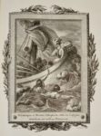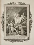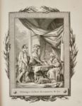 François de Salignac de La Mothe FÉNELON. Les Aventures de Télémaque, fils d'Ulysse… Paris, de l'Imprimerie de Monsieur, Didot, Barrois, etc., 1785. 2 volumes grand in-4, maroquin rouge, triple filet doré avec fleurons d'angles, dos à 5 nerfs joliment ornés, roulette intérieure dorée, tranches dorées (Reliure de l'époque). Brunet, II-1215 // Cohen, 384 /// i. (3f.)-309 / ii. (2f.)-297-(1f.). Superbe édition ornée d'un titre-frontispice gravé par Montulay, 72 planches hors-texte gravées par Tilliard d'après Monnet, et 24 planches à pleine page ornées de culs-de-lampe contenant les sommaires des chapitres placés dans le même encadrement que les figures. Très bel exemplaire en maroquin rouge de l'époque. Reliure très habilement reteintée par endroits. 3 planches roussies au premier volume et une mouillure angulaire marginale à plusieurs feuillets du second volume.