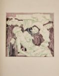 Saint FRANÇOIS D'ASSISE. Petites fleurs. Paris, Jacques Beltrand, 1913. Grand in-4, maroquin vert olive, listel droit de maroquin bordeaux serti d'un double filet doré en encadrement, dos à 4 nerfs orné de même, doublure de maroquin Lavallière, avec listel droit de maroquin vert et filets dorés en encadrement et grand décor couvrant la totalité des contreplats composé d'un motif floral à répétition mosaïqué de maroquin turquoise, violet, bleu, vert, bordeaux, avec multiples filets dorés symbolisant les tiges, gardes de reps Lavallière, doubles gardes, tranches dorées sur témoins, couverture, chemise demi-maroquin à recouvrements, étui (Marius Michel). Monod, I-4980 /// (3f.)-VI-(1f.)-256. Traduction par André Pératé. Illustrations de Maurice Denis gravées sur bois en couleurs par Jacques, Marcel, Camille et Georges beltrand, dont un hors-texte, 71 dans le texte, de nombreux ornements (bandeaux, lettrines, cul-de-lampe et vignettes) et encadrement du texte à chaque page. Tirage à 120 exemplaires sur Hollande (n° 5), celui-ci enrichi d'une belle aquarelle originale ayant servi à l'illustration et représentant saint François d'Assise et des moines soignant un blessé. Superbe exemplaire dans une reliure doublée et mosaïquée de Marius Michel.