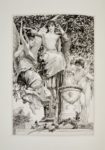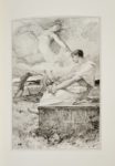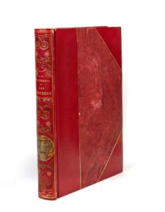 José-Maria de HEREDIA. Les Trophées. Paris, pour Descamps-Scrive, 1907. Grand in-4, bradel demi-maroquin rouge à coins, dos lisse très richement orné en long et mosaïqué, tête dorée, couverture et dos de parchemin (René Aussourd). Monod, I-5947 /// (3f.)-231-(1f.). 50 compositions en noir de luc-Olivier Merson gravées à l'eau-forte par léopold Flameng, dont le frontispice et 16 à pleine page. Tirage à 175 exemplaires sur vélin du Marais (n° 91). Bel exemplaire auquel on a joint la maquette du dos de la reliure.