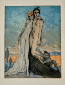 Pierre LOUŸS. Les Chansons de Bilitis. Paris, Devambez, 1925. Grand in-8, broché, étui. Monod, II-7383 /// (2f.)-VII-158-(2f.). 12 eaux-fortes originales d'Édouard Chimot, dont le frontispice en couleurs, une tête-de-chapitre en noir et 10 planches hors texte en noir. Les planches hors texte sont protégées par des serpentes imprimées. Tirage à 576 exemplaires, celui-ci un des 300 sur Montval (n° 218). Étui abîmé.