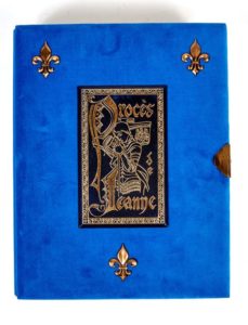 PROCÈS DE CONDAMNATION DE JEANNE D'ARC. Paris, Édition de l'Odéon, 1962. In-4, broché sous chemise de velours bleu ornementée, emboîtage. CCXXVIII-(2f.). Édition originale de la traduction du latin en français par Jean Rattaud, illustrée de 16 miniatures en couleurs d'André Dussarthou, dont 8 horstexte et 8 dans le texte. Tirage limité à 1.500 exemplaires, celui-ci un des 60 exemplaires sur vélin de Renage (n° 36), contenant 2 suites, en couleurs et en noir.