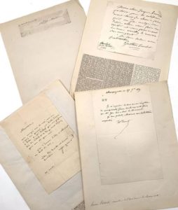 BEAUX-ARTS - PEINTRES & SCULPTEURS. 5 documents. BARTHOLDI Frédéric Auguste (1834-1904) signature découpée et contrecollée sur papier ; COURBET Gustave (1819-1877) L.A.S. à « Jacques » (s.l.n.d.) 1 p. in-12 contrecollée sur papier. Il informe son correspondant « Fromager partant pour la Californie avait tant de choses à faire qu'il n'a pu malgré son désir aller vous faire une visite et vous faire ce mot de reçu […] » ; INGRES Jean Auguste Dominique (1780-1867) L.A.S. à M. Bin, (s.l.n.d. 22 aout [1829 ?]). 2 pp. in-8, contrecollée sur papier, adresse et marques postales et billet autographe (s.l.n.d.) 1 p. in-8 oblong, contrecollée sur papier. Le 22, il annonce « Vous occupez vous de moi, vous me l'avez bien promis ; j'ai hâte d'avoir le dessin de M. Hittorf […] » ; (s.d.) il évoque une caractéristique « […] dans le collage […] ne lui affaiblisse pas le trait de crayon car il est presque invisible dans certains endroits. […] » ; VERNET Horace (1789-1863) L.A.S. Champagnette, 27 septembre 1759. ½ p. in-8. En-tête à ses initiales, lettre contrecollée sur papier. Reconnaissance de dette.
