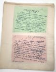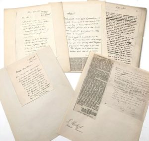 AMPERE (Jean Jacques Antoine (1800-1864) L.A.S. Paris, 8 mars 1863. 3 pp. ½ in-8, lettre contrecollée sur papier. Correspondance amicale. ; DIDOT Ambroise Firmin (s.l.) 2 janvier 1871. 1 p. ½ in-4, lettre contrecollée sur papier. Il enjoint son correspondant de tenir sa promesse. ; DUFLOT Claude (-) Manuscrit autographe signé (s.l.n.d. [18 janvier 1873]) 7 pp. in-4, contrecollées sur papier. Manuscrit intitulé « La caricature » publié dans L'Artiste de décembre 1873. ; HACHETTE Louis Christophe François (1800-1864) L.A.S. Paris,11 avril 1864. 1 p 1/3. In-8 sur papier bleu, en-tête de la librairie Hachette, lettre contrecollée sur papier. Prière d'insérer à faire apparaitre dans 6 journaux. ; HETZEL Pierre Jules (1814-1886) 3 L.A.S. et un fragment (s.l.n.d.) 8 novembre 1872, 23 octobre 1876. 4 pp. in-8 et in-12, lettres contrecollées sur papier. (s.d.) Il demande des corrections ; le 8 novembre, correspondance amicale ; le 23octobre à Hébard (Directeur du Temps) il évoque le comportement de Michel Verne (fils unique de Jules Verne). Il indique « Ce matin en rentrant en ville, je trouve Made Verne dans mon cabinet et tout en larmes - une dépêche du ( ?) de pension ou est leur fils arriva hier soir […] disoit à Verne « Venir sans aucun retard » […] il [Jules Verne] est parti éperdu s'attendant […] à trouver son fils mort. » et fragment de lettre au directeur-gérant du Temps, A propos de l'adversaire de Rémusat. (article publié collé à côté du texte). ; JOUVIN Jean-Baptiste dit Benoît (1810-1886) 2 Manuscrits autographes signés (s.l.n.d.). 62 pp. in-12 oblong, papier de différentes couleurs, contrecollés sur papier. Manuscrits intitulés « Théâtres », publiés dans Le Figaro. Le premier manuscrit composé de 32 petites pages « à propos des Erynnies, drame antique » à l'Odéon, le second évoque entre autres « La légende de Roméo et Juliette » à l'Opéra-Comique. ; LA GUEMONIERE Arthur de (1816-1875) Manuscrit autographe (s.l.n.d. [1873]). 15 pp. demi-in-4, pages contrecollées sur papier. Manuscrit intitulé « L'Empereur Napoléon » portant des corrections, ratures et indications d'impression. Il fut publié le 12 janvier 1873.