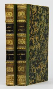 Balzac, après avoir été éditeur, associé à Urbain Canel, fut imprimeur pendant 2 ans seulement (du 29 juillet 1826 au 4 octobre 1828) et fut ruiné pour le restant de ses jours. Il imprima 168 ouvrages ; celui-ci est le 66ème en ordre chronologique, du 7 juillet 1827 ; Cette troisième édition, parue un an après l’originale, est revue et corrigée par l’auteur. Précieux exemplaire portant un envoi manuscrit de Vigny au parolier Emile Barateau, et conservé dans des reliures strictement contemporaines. Rousseurs sur quelques feuillets, dos passés. (Vicaire VII, 1053).