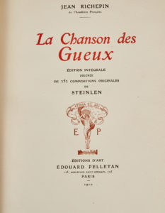 Jean RICHEPIN. — La Chanson des gueux. - Dernières chansons de mon premier livre. — Paris, Pelletan, 1910. — Ensemble 2 ouvrages en un volume in-4, maroquin bleu roi, double encadrement de filets à froid sur les plats, dos à 5 nerfs orné de...