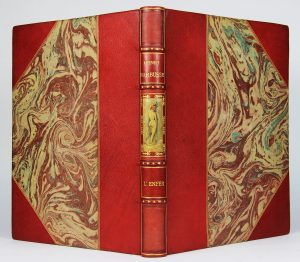 BARBUSSE (H). L’ENFER. Illustré par Edouard Chimot. Paris, Albin Michel, 1921. In-4°, demi chagrin rouge à coins, dos orné d’une petite aquarelle, t. dorée, couvertures et dos conservées (E. Berthet, relieur)