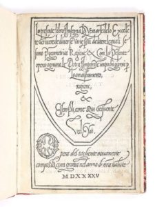 TAGLIENTE, Giovanni Antonio Lo presente libro Insegna la vera arte de lo excelle[n]te scrivere de diverse varie sorte de litere Venise, Giovann'Antonio, e Pietro fratelli de Nicolini da Sabio, 1545 CÉLÈBRE TRAITÉ DE CALLIGRAPHIE VÉNITIENNE In-8 (188 x 125 mm). Initiales gravées, caractères typographiques grecs, hébraïques, romains, cursives, gothiques et fantaisistes COLLATION : 28 ff. entièrement gravés sur bois RELIURE. Demi maroquin rouge, dos à la bradel, titre doré Court de marge Trente-neuf modèles d'écriture et neuf gravures sur bois à fond noir ou fond criblé, dont une reproduisant des caractères hébraïques. BIBLIOGRAPHIE : Hendrik Jansen, Essais sur l'origine de la gravure en bois et en taille-douce..., Paris, 1808, II, pp. 50-51
