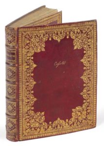 LIONI, Ottavio Rittrati di alcuni celebri pittori del secolo XVII. Rome, Antonio de' Rossi, 1731 DOUZE VIES DE PEINTRES CÉLÈBRES DU XVIIe SIÈCLE, EN RELIURE DE L'ÉPOQUE. EXEMPLAIRE DE PIERRE JAMMES ÉDITION EN PARTIE ORIGINALE In-8 (237 x 170 mm). Titre en rouge et noir, bandeaux et initiales gravés sur bois COLLATION : a4 A-Z4 2A-L4, soit 4 ff. n. ch., 272 pp. CONTENU : a1r titre, a2r [Adresse et avertissement], A1r Vita del cavaliere Ottavio Lioni, A3r Vita di Ludovico Lioni, B1r Vita de Tommaso Salini, B3r Vita de Cristoforo Roncalli, C3r Vita d'Antonio Tempesta, E1r Vita de Marcello Provenzale, E3r Vita de Giuseppe Cesari d'Arpino, G3r Vita de Simon Vouet, H4r Vita de Gio. Baglione, K2r Vita de Francesco Barbieri écrite d'après Carlo Cesare Malvasia, Q2r Vita del cavaliere Gio. Lorenzo Bernino, T2r Vita de Carlo Maratti écrite d'après Gian Pietro Bellori, 2I3r Dafne trasformata in lauro Pittura del Signor Carlo Maratti ILLUSTRATION : 12 planches hors-texte gravées en taille-douce dont onze par Ottavio Lioni et datées entre 1621 et 1625, la douzième sans auteur, 3 gravures sur bois à demi-page représentant les médailles des peintres Simon Vouet, Le Bernin et Carlo Maratti, dont 2 signées de Fücher RELIURE DE L'ÉPOQUE. Maroquin rouge, décor doré, encadrement à la dentelle et aux petits fers, supra-libris sur le premier plat “Caissoti”, dos à nerfs ornés, doublure et gardes de maroquin rouge, tranches dorées sur marbrure. Boîte PROVENANCE : Carlo Francesco Giacinto Caissotti di Chiusano (1754-1831 ; supra-libris) -- Pierre Jammes (Paris, 12-13 octobre 2010, n° 155) Légers frottements aux charnières, restauration en pied, quelques cahiers brunis Rittrati di alcuni celebri pittori est une compilation de biographies de peintres, pour certaines alors inédites comme celles de Cristoforo Roncalli ou Giovanni Baglione et d'autres tirées d'ouvrages existants, comme celle du Bernin, publiée en 1682. Celle de Simon Vouet est anonyme. Quelques-unes de ces vies sont très développées, en particulier celles du Bernin et de Maratti. De ces onze portraits, signés d'Ottavio Lioni et datés de 1621 à 1625, Bartsch n'en décrit que dix. Cet exemplaire a appartenu à Carlo Caissotti, homme dévoué à la Révolution française et à l'Empire. Il avait réuni un Museo composé d'objets antiques et de médailles qui a été dispersé en 1834 avec un catalogue. Sa très riche bibliothèque a, quant à elle, été vendue aux enchères en 1837, sans catalogue. BIBLIOGRAPHIE : Bartsch, XVII, 246