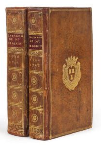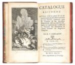 [QUENTIN DE LORANGÈRE, Louis]. GERSAINT, Edme-François Catalogue raisonné de diverses curiosités du cabinet de feu M. Quentin de Lorangère Paris, Jacques Barrois, 1744 LE CATALOGUE QUENTIN DE LORANGÈRE AUX ARMES DE LA MARQUISE DE POMPADOUR. EXEMPLAIRE D'ARMAILLÉ ÉDITIONS ORIGINALES 2 vol. in-8 (166 x 95 mm) COLLATION : xviii, 2 ff., (1)-294 pp., (1)-96 pp, avec la Table analytique des noms d'artistes ILLUSTRATION : frontispice par et d'après C.N. Cochin ANNOTATION : le catalogue Quentin de Lorangère possède les notations manuscrites des prix apposés dans les marges à l'encre brune [Précédé de :] (1). Catalogue raisonné de coquilles et autres curiosités naturelles. On a joint à la tête du Catalogue quelques Observations générales sur les Coquilles avec une Liste de principaux Cabinets qui s'en trouvent tant en France que dans la Hollande..., Paris, Flahaut et Prault, 1736. Frontispice gravé. (2) Catalogue d'une collection considérable de curiosités de différents genres dont la Vente doit commencer le Lundi 2 décembre 1737..., Paris, Prault, 1737 RELIURE DE L'ÉPOQUE. Veau blond, décor doré, armes au centre des plats, triple filet en encadrement, dos long, tranches rouges PROVENANCE : marquise de Pompadour (Cat., 1765, partie du lot 303) -- comte Louis de La Forest d'Armaillé (ex-libris) -- marquis de Luppé (ex-libris) Charnières et mors usés La section consacrée aux Estampes dans le catalogue Quentin de Lorangère contient une longue biographie de Watteau (pp. 170-188), sans doute l'une des premières. BIBLIOGRAPHIE : Journal des sçavans, avril 1744, pp. 515-523 -- Duplessis, n° 122 et 178 -- Jammes, Cabinets de curiosités, Collections, Collectionneurs, Paris, [1997], n° 287 -- Lugt, 590 -- Glorieux, pp. 364-367 -- Guichard, p. 119 -- Cohen, 206.
