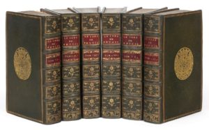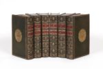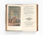 NOLLET, Jean-Antoine, dit l'abbé Leçons de physique expérimentale Paris, Hippolyte-Louis Guérin, 1759 LA SCIENCE EN COULEURS AU TEMPS DES LUMIÈRES. REMARQUABLE EXEMPLAIRE AUX TRÈS NOMBREUSES PLANCHES, TOUTES REHAUSSÉES D'UN BRILLANT COLORIS D'ÉPOQUE. RELIÉ EN MAROQUIN AUX ARMES DU COMTE DE CALENBERG 6 volumes in-12 (169 x 99mm). Fleurons et bandeaux gravés COLLATION : t.1 : cviii pp., 379 pp. ; t.2 : iv pp., 488 pp., 2 ff. n. ch. ; t.3 : iv pp., 514 pp. ; t.4 : 2 ff. n. ch., 535 pp. ; t.5 :vi pp., 1 f. n. ch., 592 pp. ; t.6 : iv pp., 527 pp. ILLUSTRATION : un frontispice d'après Moreau et 116 eaux-fortes dépliantes en coloris de l'époque, d'après Moreau, Brunet et autres RELIURES DE L'EPOQUE. Maroquin vert, armes dorées au centre des plats, filets dorés en encadrement, dos à nerfs ornés, tranches dorées PROVENANCE : comte Henri Reinecke de Calenberg (1685-1772 ; armes). Henri Reinecke, comte de Calenberg fit relier cet exemplaire à ses armes. Il était chambellan de l'Empereur, général maître de camp, seigneur de la Chambre de l'électeur de Saxe et prévôt du chapitre de Misnie (Saxe). Bibliophile raffiné et exigeant, il possédait une splendide bibliothèque qu'il avait constituée lorsqu'il vivait à Bruxelles, et dont la plupart des volumes étaient reliés, à ses armes, en maroquin de différentes couleurs : «rouge, jaune, violet, bleu, vert, citron et autres précieuses ligatures...» (cf. Guigard, II, 108, qui cite le catalogue de la vente). La collection du comte de Calenberg fut dispersée à Bruxelles, par J. Ermens, en 1773 (2048 lots pour les livres, 72 lots pour les tableaux et les estampes) Infime restauration des coiffes. Bien qu'uniformément reliés, les six volumes proviennent, comme très souvent, d'éditions différentes : la cinquième pour les tomes I à II, la quatrième pour le tome III, la troisième pour le tome IV, la deuxième pour le tome V ; le tome VI est en édition originale. Les découvertes scientifiques du milieu du XVIIIe siècle donnèrent lieu à des cours publics qui devinrent vite un phénomène social et mondain. Le frontispice des Leçons de physique expérimentale, qui représente l'abbé Nollet exécutant une expérience au milieu d'une audience choisie, est l'un des premiers documents iconographiques témoignant de cet engouement. Alain Moatti possédait l'un de ses fameux microscopes, véritable sculpture de bronze et de verre. “With carefully orchestrated demonstrations performed on 350 different instruments, the abbé entertained his enthusiastic auditors as, in the spirit of the Enlightenment, he undertook to dispel their ‘vulgar errors, extravagant fears and faith in the marvelous'. These were not mere shows, as one sees from their expanded syllabus, the famous Leçons de physique” (Dictionary of Scientific Biography, p. 145). L'abbé Nollet (1700-1770) découvrit la diffusion des liquides, observa la transmission du son dans les liquides, décrivit une machine pour tailler les verres de lunettes (1752) et inventa le premier électroscope (1747). Pour démontrer que l'électricité se déplace à grande vitesse sur une grande distance, il réalisa une expérience assez singulière. En présence du roi, il fit relier par un câble 180 gardes royaux qui formaient une ligne de plus d'un kilomètre, puis leur appliqua une décharge à l'aide d'une bouteille de Leyde, ancêtre du condensateur. «Des expériences sur l'électricité, suite aux travaux d'un Watson, d'un Nollet ou d'un Franklin, sont reproduites devant un public enthousiaste. L'homme des Lumières est curieux de toute nouveauté, persuadé que son émancipation et la maîtrise de son destin passent par la connaissance du monde. Aussi le savoir doit-il être mis à la disposition de tous. C'est le grand projet de l'Encyclopédie.» (Lumières ! Un héritage pour demain, p. 3). L'abbé Nollet est cité tout au long de l'article «Électricité» de l'Encyclopédie (volume V), notamment dans l'utilisation médicale que l'on peut faire de ce nouveau fluide. BIBLIOGRAPHIE : Cohen-de Ricci, 753 -- Guigard, II, p. 108 -- Jean Torlais, Un physicien au siècle des Lumières, l'abbé Nollet : 1700-1770, Paris, 1987 -- Dictionary of Scientific Biography, X, 147-148 -- Catalogue de l'exposition Lumières ! Un héritage pour demain, Paris, BnF, 2006, p. 3