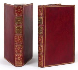 WINCKELMANN, Johann Joachim Histoire de l'art chez les Anciens Paris, Saillant, 1766 MANIFESTE DE L'ART NÉOCLASSIQUE, TEXTE MAJEUR POUR L'HISTOIRE DE L'ART. RARE EN MAROQUIN DE L'ÉPOQUE PREMIÈRE ÉDITION FRANÇAISE 2 volumes in-8 (197 x 123 mm). Traduction par Gottfried Sellius, revue par Jean-Baptiste-René Robinet. COLLATION : t. I : π2 2*-3*8 4*4 5*8 A-Y8 Z4 : (2) ff., LVI-360 pp. ; t. II : π2 *8 2*6 A-X8 Y4 : (2) ff., XXVIII-343 pp CONTENU : De l'Origine de l'Art & des causes de ses différences chez les nations différentes. - Des différentes matières employées par la sculpture. - De l'Art chez les Égyptiens. - De l'Art chez les Étrusques & chez leur Voisin. - Des raisons et des causes de la perfection de l'Art chez les Grecs, et de sa supériorité sur celui des autres Nations. Etc. ILLUSTRATION : 22 jolies et fines vignettes gravées sur cuivre, dont une signée de Frankendaad : 2 sur les pages de titre, 11 en-têtes, 8 culs-de-lampe, 1 hors-texte. RELIURES DE L'ÉPOQUE. Maroquin rouge, décor doré, triple filet en encadrement, dos à nerfs ornés, tranches dorées Livre capital, considéré comme l'encyclopédie des arts dans l'antiquité, traduit de l'allemand par Gottfried Sellius, retouché par Jean-Baptiste-René Robinet. “L'histoire de l'Art des Anciens, que j'ai entrepris d'écrire, n'est pas une simple narration chronologique des révolutions & des changemens qu'il a subis dans la suite des temps. Je prends le mot Histoire dans la signification la plus étendue qu'il a dans la langue Grecque, & mon dessein est de donner un essai d'un Systême de l'Art [...] Mon principal objet dans tout cet Ouvrage est la nature de l'Art : l'histoire des Artistes y est pour peu.” BIBLIOGRAPHIE : Brunet V, col. 1463 -- Cohen, 1068