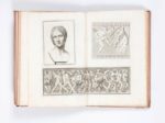 WINCKELMANN, Johann Joachim Monumenti antichi inediti spiegati ed illustrati Rome, A spese dell'autore, 1767 AGRÉABLE EXEMPLAIRE DU DERNIER GRAND OUVRAGE DE WINCKELMANN, LE SEUL RÉDIGÉ EN ITALIEN ÉDITION ORIGINALE 3 volumes in-folio (389 x 264 mm). Pages de titre imprimées en noir et rouge. Vignettes gravées sur cuivre sur les pages de titre, initiales et culs-de-lampe gravés sur bois, nombreuses et grandes vignettes gravées sur cuivre en guise d'en-tête et culs-de-lampe Le troisième volume consiste en un Supplément constitué de 5 ouvrages de Stefano Raffei : (1) Ricerche sopra un Apolline della Villa dell'Eminentissimo Signor Cardinale Alessandro Albani, Rome, Generoso Salomoni, 1772 ; (2) Dissertazione sopra un singolar combattimento espresso in bassorilievo..., [s.l.s.n., 1773] ; (3) Saggio di osservazioni sopra un bassorilievo..., Rome, Generoso Salomoni, 1773 ; (4) Il Nido canzone didascalia sopra un antico nido di marmo..., Rome, Generoso Salomoni, 1778 ; (5) Osservazioni sopra alcuni antichi monumenti..., Rome, Generoso Salomoni, 1779 COLLATION : π4 2*4 3*4 a-n4 : XXIV-CIII pp. (la collation du second cahier commence bien avec 2*, sans manque) ; vol. II : π4A-Z4 2A-Z4 3A1 : (4) ff., 368 pp., (1) f. ; vol. III : A-C4 A-B4 C6 A-D4 E-F6 A-B4 C6 A-H4 : V-18 pp., 28 pp., 43-(1) pp., 56 pp., 28 pp., 64 pp. ILLUSTRATION : vol. I : 208 gravures sur cuivre, dont 24 à pleine page et 20 à double-page ; vol. III : 15 planches gravées sur cuivre RELIURES UNIFORMES DE L'ÉPOQUE. Cartonnages, plats de papier moiré rose, dos à la bradel de papier maroquiné rouge, tranches mouchetées rouges PROVENANCE : timbre à sec aux initiales “P.B.C” non identifiées Quelques accrocs et mouillures angulaires sans gravité. Reliures un peu usées, coins émoussés dont l'un avec manque Peu avant la parution de cet ouvrage, Johann Joachim Winckelmann (1717-1768) venait d'être nommé surintendant des Antiquités de Rome. Ce recueil est “auprès des savants le véritable titre de Winckelmann à leur admiration [...] C'est là qu'il établit les principes fondamentaux de la critique moderne pour l'interprétation des monuments” (Vinet). BIBLIOGRAPHIE : Brunet, V, col. 1463 -- Vinet, 1452 -- Cicognara, 2506 -- Millard, Italian, IV, 164