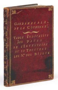 [GARDE MEUBLE DE LA COURONNE] Table indicative des pages de l'inventaire ou se trouvent les Nos des Bijoux, leur Description et leur valeur, ainsi que celle des Bronzes et des Bustes de Marbres [Paris], vers 1780 IMPORTANTE TABLE DE CORRESPONDANCE MANUSCRITE DES BIJOUX DE LA COURONNE, PRÉSENTANT L'INVENTAIRE DE LEUR VALEUR MANUSCRIT de 70 pp. in-4 (212 x 132 mm), encre brune, tableaux par colonne RELIURE DE L'ÉPOQUE. Maroquin rouge, décor doré, titre sur les plats, encadrement de filets, fleurs de lys dans les angles, dos long, gardes de soie bleue, tranches dorées PROVENANCE : Guillaume Combrouse (1808-1873 ; ex-libris) Quelques taches sur les plats, un mors fendu “L'utilité de cette table consiste dans la facilité qu'elle procure de pouvoir trouver de suite dans l'inventaire, la description de tel bijou que l'on veut d'après le N° qu'il porte, de même que l'on peut trouver trouver l'armoire et la Tablette où il se trouve placé”. Bijoux, bronzes et tables de marbre sont ici proprement estimés par l'administration du Garde meuble.