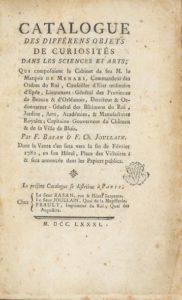 [MÉNARS, Abel-François, marquis de Marigny et de]. JOULLAIN, François-Charles, et Pierre-François BASAN Catalogue des différens objets de curiosités dans les sciences et arts ; qui composoient le cabinet de feu M. le Marquis de Menars, [...] Par F. Basan & F. Ch. Joullain. Dont la vente s'en fera vers la fin de février 1782, en son Hôtel, Place des Victoires Paris, Basan, Joullain, Prault, 1781 CATALOGUE DE LA VENTE MÉNARS AVEC LES FAMEUSES EAUX-FORTES DE LA MARQUISE DE POMPADOUR ÉDITION ORIGINALE In-8 (208 x 130 mm) COLLATION : a6 A-G8 I6, soit XI pp., 140 pp. ILLUSTRATION : 1 frontispice gravé par Benoît-Louis Prévost d'après Charles-Nicolas Cochin ; 2 eaux-fortes hors texte gravées par la marquise de Pompadour elle-même, sœur du marquis de Ménars ANNOTATION : prix d'adjudication et noms des acquéreurs inscrits à l'encre brune par une main contemporaine et une seconde, au crayon, du XXe siècle RELIURE SIGNÉE DE DUPRÉ. Demi-maroquin bleu à coins, filets dorés, dos à nerfs orné PROVENANCE : Frédéric Reiset (1815-1890 ; tampon humide de son chiffre sur le titre ; sa vente, 15 avril 1876, n° 968) -- Rapilly, libraire et marchand d'estampes au n° 5, quai Malaquais, où il fut racheté le 26 avril 1879 par Paul Leroy (Léon Gaucher), ancien directeur de la revue L'Art, (Paris, 13 décembre 1907, n° 54) Charnière fragile, restauration aux deux derniers feuillets avec reprise du texte au crayon