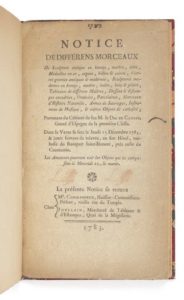 [CAYLUS, duc de]. Notice de différens morceaux de sculpture antique en bronze, marbre, terre, médailles en or, argent, billon & cuivre, pierres gravées antiques & modernes, sculptures modernes en bronze, marbre, ivoire, bois & plâtre, tableaux de différens maîtres, dessins & estampes encadrées, pendules, porcelaines, morceaux d'histoire naturelle, armes de sauvages, instrumens de musique, & autres objets de curiosité Paris, Maître Commandeur & Joullain, 1783 L'UNE DES VENTES DU DUC DE CAYLUS ÉDITION ORIGINALE Plaquette in-8 (209 x 125 mm) RELIURE. Dos à la bradel de cartonnage marbré PROVENANCE : Charles Le Normant du Coudray (1712-1789 ; ex-libris manuscrit répété) -- Henry Panier (ex-libris) -- François Heim (cachet humide, Paris, 26-30 juillet 2005) -- Paris, 26 février 2014, n° 245 Papier bruni C'est la vente aux enchères après décès des objets d'art de la collection d'Achille-Joseph Robert de Lignerac, duc de Caylus (1733-1783). Le duc de Caylus fut tué lors d'un duel avec le marquis de Seignelay, amant de sa femme. Précieux exemplaire de la bibliothèque de l'amateur orléanais Charles Le Normant du Coudray (1712-1789), avec ex-libris manuscrit sur le titre répété.
