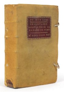 [MALON de BERCY, Marie-Françoise, marquise de, née Taschereau de Baudry] Inventaire après le décès de Melle Taschereau de Baudry, veuve de Nicolas Charles Malon Bercy [30 juin 1786]. 30 juin 1786 PRÉCIEUX INVENTAIRE MANUSCRIT DU CHÂTEAU DE BERCY, AVEC QUATRE SUPERBES PLANS, À LA VEILLE DE LA RÉVOLUTION MANUSCRIT écrit aux encres brune ou noire, de plusieurs mains, sur plus de 641 feuillets in-folio (330 x 205mm) “L'an 1786 le vendredi 30 juin trois heures de relevé à la requête” de Nicolas Charles de Malon de Bercy (...) époux de la défunte Marie Françoise Taschereau de Baudry et “tuteur honoraire des seigneurs et demoiselle de Bercy”, de ses petits enfants mineurs : Charles Jean François de Malon de Bercy et Alexandrine Charlotte de Malon de Bercy, il est procédé à l'inventaire de ses biens, situés : 1. Inventaire de l'hôtel particulier de la rue de Varenne (f° 1-82r) : le mobilier, les objets usuels, les tableaux (seuls les portraits ne sont pas chiffrés), vaisselle, sculptures, pendules, garde robe, cave, voitures etc. L'estimation des livres de la bibliothèque est confiée au libraire A. F. Knapfen, rue Saint-André-des-Arts. Elle ne figure pas dans le présent manuscrit 2. Le château de Bercy (f° 83-244) : l'inventaire de la vaste demeure de Bercy (grand château, petit château, chapelle, bibliothèque, salle de comédie et dépendances) dure du 13 au 24 juillet. Le notaire répertorie les objets comme lors d'un inventaire précédent au moment de la donation avec réserve d'usufruit faite au fils du marquis de Bercy qui décédera avant son père. On énumère et note les objets manquants. L'inventaire des caves occupe 3 ff., la vaisselle et l'argenterie s'étendent sur 5 ff. À partir du f. 191, un inventaire de la bibliothèque de Bercy s'étend jusqu'au f. 238v, suivent les bijoux, par exemple : “une croix de diamants brillants composée d'un gros diamant au milieu, de six autres moyens et de douze plus petits, deux pompons aussi de diamants brillants composés d'un moyen brillant au milieu de sept autres d'entourage et de plusieurs autres plus petits” 3. L'inventaire du vaste domaine rural du château de Baudry près de Tours s'est déroulé du 28 juillet au 2 août 1786 (123 ff.) 4. L'inventaire des papiers s'est étendu du 14 août au 19 octobre 1786 (309 ff.) JOINTS : 4 superbes plans manuscrits aquarellés et à l'encre de chine, dépliants, du château de Bercy : 1. Plan du rez-de-chaussée et des changements du château de Bercy (713 x 325mm) 2. Premier étage (715 x 330mm) ; 3. Second étage (720 x 325mm) 4. Un quatrième plan fait de trois morceaux en fragments se complétant RELIURE DE L'ÉPOQUE. Daim, pièce de titraison en maroquin contrecollée sur le plat supérieur, en lettres dorées bordées de filets dorés Quelques feuillets détachés Le château de Bercy aurait été construit par François Le Vau, frère du célèbre Louis Le Vau d'après les dessins de François Mansart. La fiche wikipedia offre une merveilleuse compréhension, par le texte et par l'image, de ce qui fut l'un des plus importants et des plus beaux châteaux construits dans l'immédiat entourage de Paris, avec ses superbes jardins en bordure de Seine. Tout fut démembré et de Bercy, il ne reste plus rien. Ce manuscrit permet surtout de saisir la situation de relatif abandon du domaine de Bercy à la fin du XVIIIe siècle. Les héritiers étant en bas âge à la mort de leurs parents, la succession ne fut réglée qu'à leur émancipation (voir numéro suivant). Certaines archives Malon de Bercy sont aujourd'hui divisées entre les Archives départementales du Val-de-Marne (fonds 46J), le Palais Galliera et le Musée de Sceaux. Certaines sculptures et tableaux prendront au XIXe siècle le chemin du château de Brissac. WEBOGRAPHIE : Gilles Moreau, “Artisans et marchands au services des Malon de Bercy” : https://orfevrerie.wordpress.com/2012/01/19/artisans-et-marchands-au-service-des-malon-de-bercy/