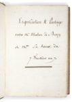 [MALON de BERCY, Nicolas Charles de, marquis de]. Liquidation & partage entre Mr Malon de Bercy et Melle sa sœur, du 7 Fructidor an 7 [Paris], 24 août 1799 LE CHÂTEAU DE BERCY : IMPORTANTS ÉLÉMENTS D'ARCHIVES. SUCCESSION DE L'UNE DES GRANDES FAMILLES DE LA ROBE ET DE LA FINANCE AU SIÈCLE DES LUMIÈRES : LES MALON DE BERCY QUI S'ÉTEIGNENT ICI CHEZ LES NICOLAŸ MANUSCRIT rédigé à l'encre brune sur papier bleuté In-4 (295 x 215 mm) COLLATION : 1 f. n. ch., 628 pp., 7 ff. n. ch. RELIURE DE L'ÉPOQUE. Veau marbré, décor doré, encadrement d'une roulette, dos orné, tranches mouchetées Reliure frottée, manque à la coiffe supérieure Il s'agit de la succession entre Charles-Jean-François de Malon de Bercy (1779-1809) et sa sœur Alexandrine-Charlotte-Marie de Malon de Bercy (1781-1808). Liquidation très détaillée comprenant entre autres le domaine de Bercy où quatre-vingt-seize fermiers différents versaient des fermages. Alexandrine-Charlotte épousa en 1807 Christian de Nicolaÿ (1777-1839), marquis de Goussainville. Son second fils, Gabriel de Nicolaÿ (1808-1878), sera le dernier marquis de Bercy et l'ultime propriétaire du château de Bercy, avant son complet démantèlement.