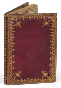 [MUSÉE DU LOUVRE] Explication des peintures, sculptures et gravures, de Messieurs de l'Académie royale, dont l'exposition a été ordonnée, suivant l'intention de Sa Majesté, par M. le Comte de La Billardrie d'Angiviller Paris, Imprimerie de la Veuve Hérissant, 1789 CATALOGUE D'EXPOSITION EN RELIURE DE L'ÉPOQUE ÉDITION ORIGINALE In-12 (156 x 95 mm) COLLATION : 30 ff. RELIURE DE L'ÉPOQUE. Maroquin rouge, décor doré, dentelle en encadrement, gros fleuron aux angles, dos long orné, doublure et gardes de papier doré gaufré d'Augsbourg, tranches dorées Petite trace noire sur le plat supérieur, abrasions aux angles et aux coiffes