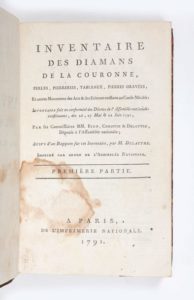 BION, Jean-Marie, Charles Gabriel Frédéric CHRISTIN et François-Pascal DELATTRE Inventaire des diamants de la Couronne, perles, pierreries, tableaux, pierres gravées... Paris, Imprimerie nationale, 1791 LES DIAMANTS DE LA COURONNE ÉDITION ORIGINALE 2 parties en un volume in-8 (195 x 120mm) COLLATION : 2 ff. n. ch., pp. 281-296, 276 pp., 279 pp. (Inversion : les pages 281-296 (Rapport de M. Delattre) terminant la seconde partie ont été reliées en tête du volume) RELIURE DE L'ÉPOQUE. Basane granitée, dos long PROVENANCE : Joseph-Antoine Lebert, médecin vétérinaire et bibliophile au Neubourg (Eure) au milieu du XIXe siècle (ex-libris manuscrit ; Paris, 1874, lot 1131 : “2 part. en un vol. v. gran.) Reliure restaurée, dos remonté. Tache sur la page de titre WEBOGRAPHIE : vente Lebert (1874) : https://gallica.bnf.fr/ark:/12148/bpt6k58228352.texteImage