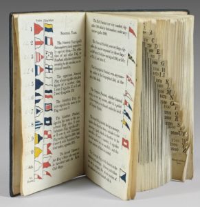 [Royal Squadron]. Signals for the use of the members of the Yacht Club Londres, Printed by G. Hayden, Brydges street, Covent Garden, 1817 RARE ET ÉTONNANT PREMIER LIVRE DE CODE CRÉÉ POUR LES MEMBRES DU PLUS HUPPÉ DES CLUBS NAUTIQUES, FONDÉ EN 1815 : LE ROYAL SQUADRON. CE CLUB INITIA EN 1851 LES FAMEUSES RÉGATES DEVENUES PAR LA SUITE CELLES DE LA COUPE DE L'AMERICA. BEL EXEMPLAIRE EN MAROQUIN BLEU MARINE, PARFAIT FORMAT POUR LA POCHE D'UNE VESTE DE QUART ÉDITION ORIGINALE In-12 (170 x 105mm) Imprimé sur un beau papier vergé, non paginé, mais 144 pp. ILLUSTRATION : très nombreux drapeaux coloriés à la main RELIURE DE L'ÉPOQUE. Maroquin bleu nuit, dos à nerfs En tête de la page de titre, on peut lire la mention suivante : “This book belongs to the club : and is to be returned to the secretary whenever the holder of it ceases to be a member.” Ce ne fut pas le cas. Worldcat ne retrouve aucun exemplaire aux États-Unis. COPAC ne recense que trois exemplaires en Angleterre : l'un au National Maritime Museum, l'autre à Cambridge et le troisième au château de Kingston Lacy (National Trust). Il existe aussi une seconde édition de ce livre datée de 1822. L'ouvrage se présente comme une intense combinaison de chiffres et de lettres conjugués par un système codifié de drapeaux ici aquarellés permettant d'établir une conversation en mer entre les membres de l'un des plus chics des clubs. Les pages ne sont pas numérotées. Mais on remarque qu'à la lettre “T”, il faut élever les signaux correspondant au chiffre 2525 pour dire “Tea”, ou 1055 pour dire “French”. Le Royal Yacht Squadron est le plus prestigieux club nautique du monde. Il a été fondé le 1er juin 1815 sous le nom de The Yacht Club dans la Thatched House Tavern à Londres. Cette mention (The Yacht Club) figure sur la page de titre du présent volume. En 1817, il accueillera le Prince régent comme membre. Devenu roi sous le nom de George IV en 1820, le club prendra alors le nom de Royal Yacht Club pour adopter son nom définitif en 1833. Les yachts de ses membres prennent le suffixe RYS et sont autorisés à arborer le White Ensign de la Royal Navy plutôt que le Red Ensign utilisés par la majorité des autres navires immatriculés au Royaume-Uni. Le club est à l'origine de la création de la Coupe de l'America en 1851. Ce club célèbre, fondé il y a deux cents ans, est aujourd'hui basé dans le château de Cowes.