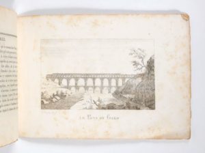 BONAFOUX, Gaston Monumens antiques de Nîmes, dessinés et gravés à l'eau-forte Nîmes, Libraires et concierges des Monumens antiques, 1824 ÉTUDE D'HISTOIRE DE L'ART SOUS LE SOLEIL DU MIDI ÉDITION ORIGINALE In-8 oblong (150 x 220 mm). COLLATION : 16 pp. de description pour les sept monuments romains de la ville : l'Amphithéâtre, La Maison-Carrée, La Tourmagne, La Porte de France, Le Temple de Diane, La Porte d'Auguste, Le Pont du Gard. ILLUSTRATION : 9 eaux-fortes hors-texte de Gaston Bonafoux. ANNOTATION : note manuscrite au crayon au revers de la couverture : «Visités Nîmes et Pont du Gard le 18-19 octobre 1900. Fonteanive» et annotations marginales. BROCHÉ, tel que paru. PROVENANCE : Rodolfo Fonteanive (cachet humide répété tout au long de l'exemplaire). Dos renforcé, marges de la couverture un peu fatiguées