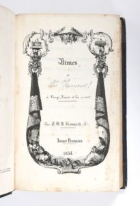 FROSSARD, Émilien Benoît Daniel Tableau pittoresque, scientifique et moral de Nismes et de ses environs, à vingt lieues a la ronde Nîmes, Bianquis-Gignoux, 1834-1835 BEL EXEMPLAIRE EN RELIURE DE L'ÉPOQUE [relié à la suite :] Du même, Tableau pittoresque... Supplément. Nîmes, Bianquis-Gignoux, 1838 ÉDITIONS ORIGINALES 2 tomes et un Supplément reliés en un volume (205 x 126mm) ILLUSTRATION : nombreuses gravures, la majorité hors-texte, certaines dépliantes RELIURE DE L'ÉPOQUE. Dos et coins de veau bleu, dos long orné de filets dorés, plats de papier ciré bleu, tranches marbrées Quelques rousseurs Le pasteur Émilien Benoît Daniel Frossard (1802-1881) fut en charge de l'église réformée de Nîmes, des aumôneries du collège et de la prison, de 1825 à 1847, en plein essor du Réveil.