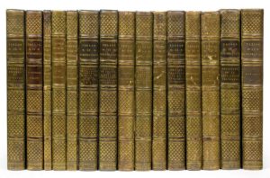 DELAROCHE Paul, Louis-Pierre HENRIQUEL-DUPONT, et Charles LENORMANT. Trésor de numismatique et de glyptique, ou Recueil général de médailles, monnaies, pierres gravées, bas-reliefs, etc., tant anciens que modernes. Paris, Rittner et Goupil, 1834-1850. 20 parties reliées en 15 volumes in-folio. Très nombreuses planches. Reliures anglaises signées de John Wright. Dos à nerfs très ornés et coins de maroquin vert, tranches dorées. Rousseurs éparses, plus ou moins prononcées. Frottements, charnières usées et quelques-unes fendues, certains plats très fragilisés