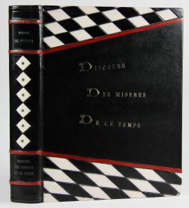 RONSARD. DISCOURS DES MISERES DE CE TEMPS. Paris, le Fuseau chargé de laine, 1930. 1 vol. in-4°, maroquin noir mosaïqué, plats ornés d’une composition en perspective de damiers noir et blanc, dos mosaïqué de carrés blancs, chemise de cuir...