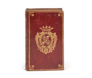 filet encadrant les plats avec fleurons d'angles et en écoinçons et avec armoiries dorées au centre, coupes filetées, roulette intérieure dorée, doublures et gardes de tabis bleu, tranches dorées (reliure de l'époque).