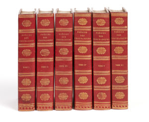 RAYNOUARD (François-Just-Marie). — Choix des poésies originales des troubadours. — À Paris, de l'imprimerie de Firmin Didot, 1816-1821. — 6 volumes in-8, maroquin rouge, dos à nerfs, plats filetés avec fleurons dorés sur fond pointillé,...