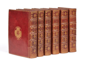 filet doré à fleurons d'angles sur les plats avec armoiries dorées au centre, coupes filetées, roulette intérieure dorée, tranches dorées (reliure de l'époque).