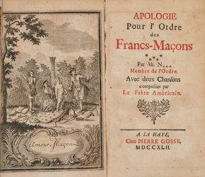 COMPREND LA PREMIÈRE TENTATIVE IMPRIMÉE DE FORMULER LES BUTS DE LA FRANC-MAÇONNERIE. Avec « deux chansons composées par le Frère américain » : l'une, « Les vrais biens sont peu durables », figure ici en édition originale et COMPREND SANS DOUTE LA PREMIÈRE ALLUSION À UN HAUT GRADE JAMAIS PUBLIÉE (« Ajoutons à notre règle / Un point qui vous plaira fort, / C'est qu'au Chevalier de l'Aigle / on boive un grand rouge bord »).
