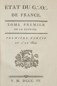 GRAND ORIENT DE FRANCE. — ÉTAT DU G∴ O∴ DE FRANCE. — À Paris, de l'imprimerie du G∴ O∴ de France, 1804. 4 parties en 2 volumes in-8, demi-basane brune, dos à nerfs filetés de marron, tranches mouchetées (reliure moderne).