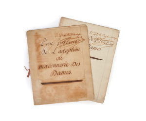 – MANUSCRITS : « Cathéchisme des trois grades pour les dames Maçonnes (années 1760, 96 pp. dans un volume in-12 relié en vélin souple de l'époque) ; « Grade des Sublimes Écossaises » ; « Passe-partout de l'adoption ou Maçonnerie des dames » ; « Cahier pour la toute-puissante Grande-Maîtresse » ; « Grade de l'Élue des Dames » ; « Loge d'adoption du 1er grade, Cahier du Vénérable » ; etc.
