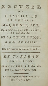 MAÇONNERIE D'ADOPTION. — RECUEIL DE DISCOURS ET POÉSIES MAÇONNIQUES, de différens F[rères] et S[oeurs] de la R[évérende] L[oge] de La Douce-Union, à l'O[rient] de Paris : lus et chantés dans cette L[oge]. — Au premier jour du dixième...