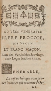 4 vignettes gravées sur bois : la première au titre représentant un tablier, la deuxième à la signature de l'épître dédicatoire, représentant une équerre et un compas, les deux autres étant des bandeaux ornementaux à motifs maçonniques.
