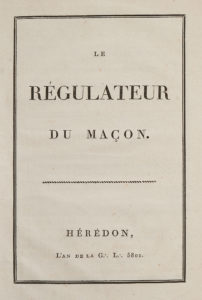 RÉGULATEUR DU MAÇON (LE). — Hérédon, s.n., l'an de la G L 5801 [1801, sic pour 1803]. — 5 fascicules reliés en 2 volumes, l'un en bradel cartonné brun avec titre doré sur le premier plat dans un triangle doré, pièces de titres brunes...