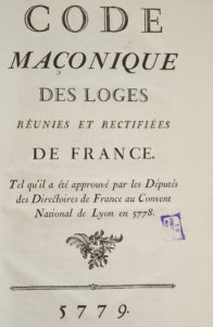 - 1. CODE MAÇONNIQUE DES LOGES REUNIES ET RECTIFIEES DE FRANCE. Tel qu'il a été approuvé par les députés des directoires de France au Convent national de Lyon en 5778 [1778]. S.l.n.n., 5779 [1779]. Illustration de bois gravés dans le texte, certains à motifs maçonniques. ENVOI AUTOGRAPHE SIGNÉ DE FRÉDÉRIC-RODOLPHE SALTZMANN EN QUALITÉ DE CHANCELIER DU DIRECTOIRE ÉCOSSAIS DE BOURGOGNE SÉANT À STRASBOURG (avec sceau de cire sous papier de ce Directoire) : « Expédié à l'usage de la Loge réunie & rectifiée de Ferdinand aux Neuf Étoiles, à l'Orient de Strasbourg... » Franc-Maçon actif ayant adhéré à la Stricte Observance Templière, il participa aux Convents de Lyon en 1778 et à celui de Wilhelsmbad en 1782.
