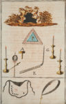 ILLUSTRATION DE 8 COMPOSITIONS EN COULEURS À PLEINE PAGE (encre de Chine et plume avec rehauts d'aquarelle), soit une pour chaque grade concerné. Avec un cul-de-lampe ornemental (encre brune et plume). Une mention de la même main, répétée à la fin des rituels de Maître parfait et de Maître parfait anglais précise « Collationné à l'original par le f. d'Huc, prince équitable de Jérusalem ». S'agirait-il du chevalier Louis-Philippe Auguste d'Huc, fondateur et Vénérable de la Loge L'Ancienne et la Réunion des Élus de Montpellier ?