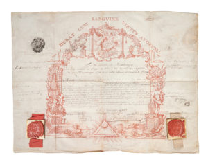 Pierre-François Isnard et tirée en sanguine, sceaux de cire de la Loge et du Comité Écossais de la Loge sur papier en enchâssés des supports métalliques appendus à des rubans de soie, l'un rouge, l'autre grège, cachet encré de la Loge.
