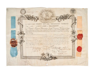 Bruxelles, 10 mai 1785. — Une p. in-folio oblong sur parchemin gravée sur cuivre illustrée d'une grande composition, avec ajouts manuscrits, sceaux de cire de la Loge sur rubans de soie, cachet encré de la Loge.