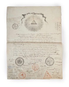 SUPRÊME CONSEIL GÉNÉRAL DU RITE DE MEMPHIS. — Pièce signée par plusieurs membre du Conseil, dont Jean-Étienne Marconis de Nègre en qualité de Grand Hiérophante Sublime Maître de la Lumière. — Paris, 21 décembre 1852. Une p. in-folio...