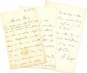 le Japon ancien et le Japon moderne, à propos d’articles pour la revue L’Artiste et de leur illustration (notamment avec des petits bois japonais) ; une à Édouard Houssaye, au sujet d’un sonnet dont Burty demande la copie autographe.{CR}8 mars 1877 : il voudrait insérer une lettre de Fromentin dans son volume « Maîtres et Petits Maîtres qui s’élabore en ce moment chez Charpentier » ; dans sa lettre Fromentin remercie pour l’envoi par L’Artiste d’un volume, dans lequel il est question de lui : « Serait-ce le volume de votre père ? De Gautier ? En tout cas, il doit être question d’un Été dans le Sahara car Fromentin annonce Une année dans le Sahel. » 12 juillet 1880 : remerciements pour une note sur les Lettres d’Eugène Delacroix : « ces lettres nous découvrent un robuste ouvrier, un passionné de la profession. C’est un sentiment devenu rare »…