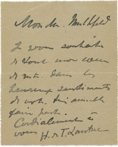 Henri de TOULOUSE-LAUTREC (1864-1901). L.A.S., [Paris 3 avril 1896], à Lucien Mulhfeld ; 1 page in-12, adresse au dos (carte-lettre).{CR} « Je vous souhaite de tout mon cœur de rester dans les heureux sentiments de votre très aimable faire...