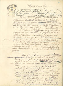 à l’intérieur, dos à nerfs mosaïqué avec filets dorés (un peu passé), étui (Le Douarin). {CR}Manuscrit de travail de ce récit préhistorique fantaisiste contant l’histoire de Papahouette et son amour pour Evohé. Il a paru en avril 1931 dans le Crapouillot et sera édité à la Librairie de France cette même année avec des eaux-fortes de l’auteur, en collaboration avec Dunoyer de Segonzac. {CR}Le manuscrit, abondamment corrigé et raturé, en partie au crayon rouge et bleu, comporte une première partie numérotée de 16 pages, et une autre, numérotée de 1 à 37. Il est illustré de 13 dessins ou croquis dans les marges ou sur les versos. {CR}Envoi en tête de la première page : « A cet autre Papahouette, au tendre Adal. Fraternellement. Villeboeuf. 13 Août 1931 ».