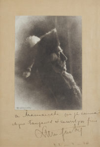 coiffé d’un bonnet. Dédicace au-dessous : « à Maniouche que je connais depuis toujours & ce n’est pas fini Lucien Guitry 22-2-20 ».