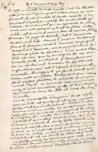 L’amour proprement dit est le sentiment qui en approche le plus. « La maternité échappe à toute règle, parce qu’elle est spontanée et sans aucun choix […] mais l’autre amour veut un culte au sens propre du mot », car il résulte d’un choix, « fruit de volonté » ; il faut de la volonté et « de la Fidélité pour bien jouer du violon, ou pour bien faire n’importe quoi, et certainement aussi pour bien penser. » Le plaisir de penser ne se conçoit pas sous la contrainte, « de même sous le serment on ne peut connaître le plaisir d’aimer. […] La Foi se passe de preuves. En toute action, il faut vouloir et croire. La Charité est un amour entièrement voulu, que porte l’Espérance, mais c’est la Foi qui porte les deux. Et la Foi est de volonté en quoi elle s’oppose à la croyance, qui n’est que de nature ». Il reste que « la Maternité représente le mieux toute la perfection possible de nos sentiments et même de nos pensées. Et il y a une parenté profonde entre les sentiments religieux et les sentiments familiaux »… etc. {CR}Une bande de papier collée à la fin de la lettre dissimule quelques lignes d’envoi de ce « deuxième chapitre ».
